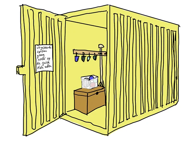 In de herfst van 2024 begon Studio Bas Sala met het eerste programmadeel op het Evenaarplein. Niet met complexe plannen of ingewikkelde praat, maar met hout, hamers, soep en voetbal. Een opvallende gele container werd op het plein geplaatst en diende als  opslagplaats en uitvalsbasis. We gingen letterlijk aan de slag om verhalen van buurtbewoners op te vangen en te werken aan sociale verbondenheid.